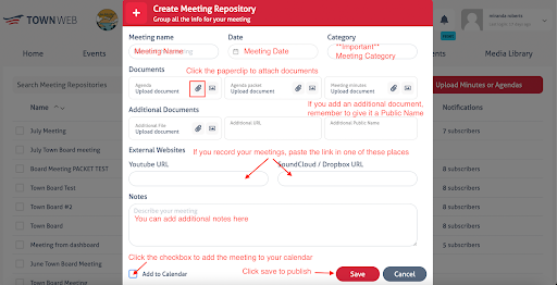 *IMPORTANT: If you do not select a meeting category it will not show up on your website or send notifications to subscribers! - Click on the paperclip icon under “Agenda” to add attach your agenda to the meeting